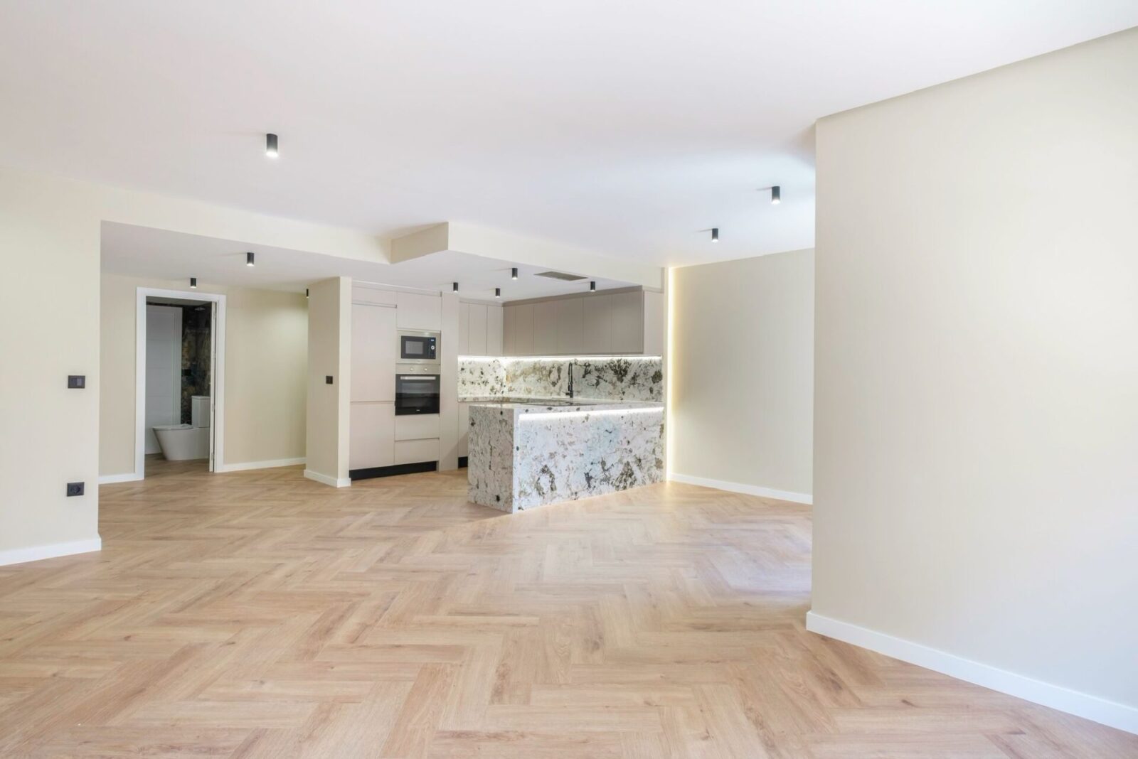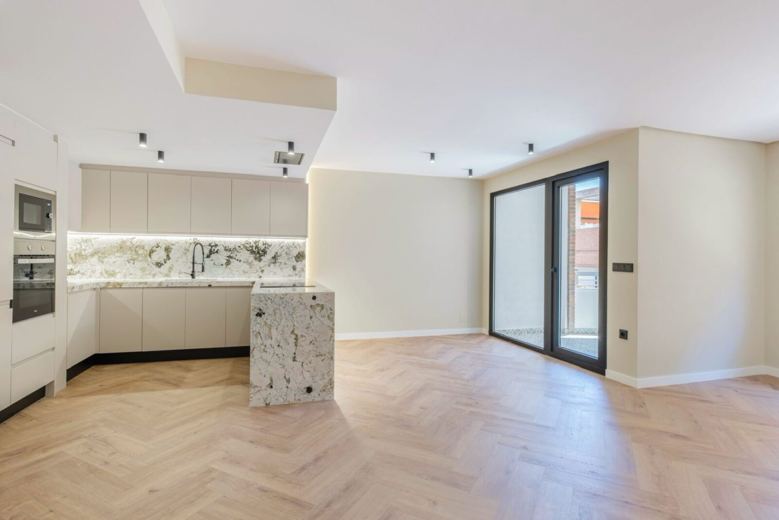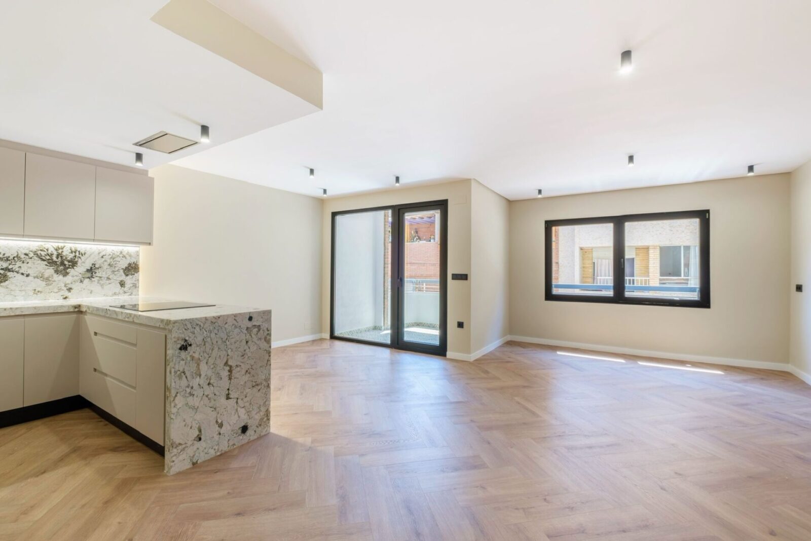 La vivienda destaca por un diseño contemporáneo y luminoso, con una zona de día abierta que integra cocina y salón, potenciando la amplitud y la entrada de luz natural. La cocina, de líneas limpias y elegantes, combina mobiliario en tonos neutros con una isla revestida en piedra natural que aporta carácter y funcionalidad, mientras que el suelo en espiga añade calidez y continuidad a todo el espacio.