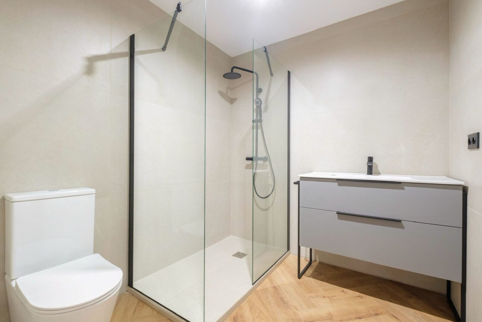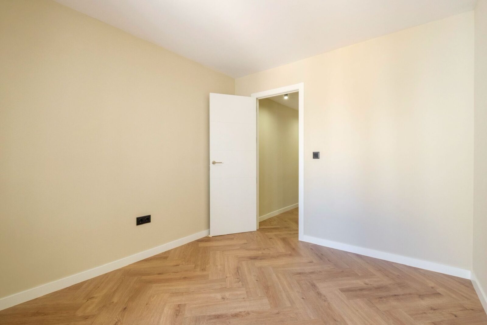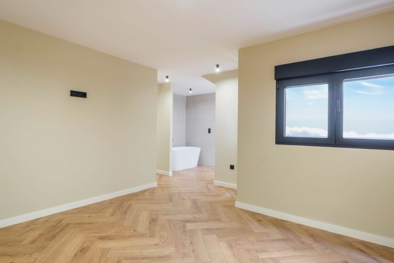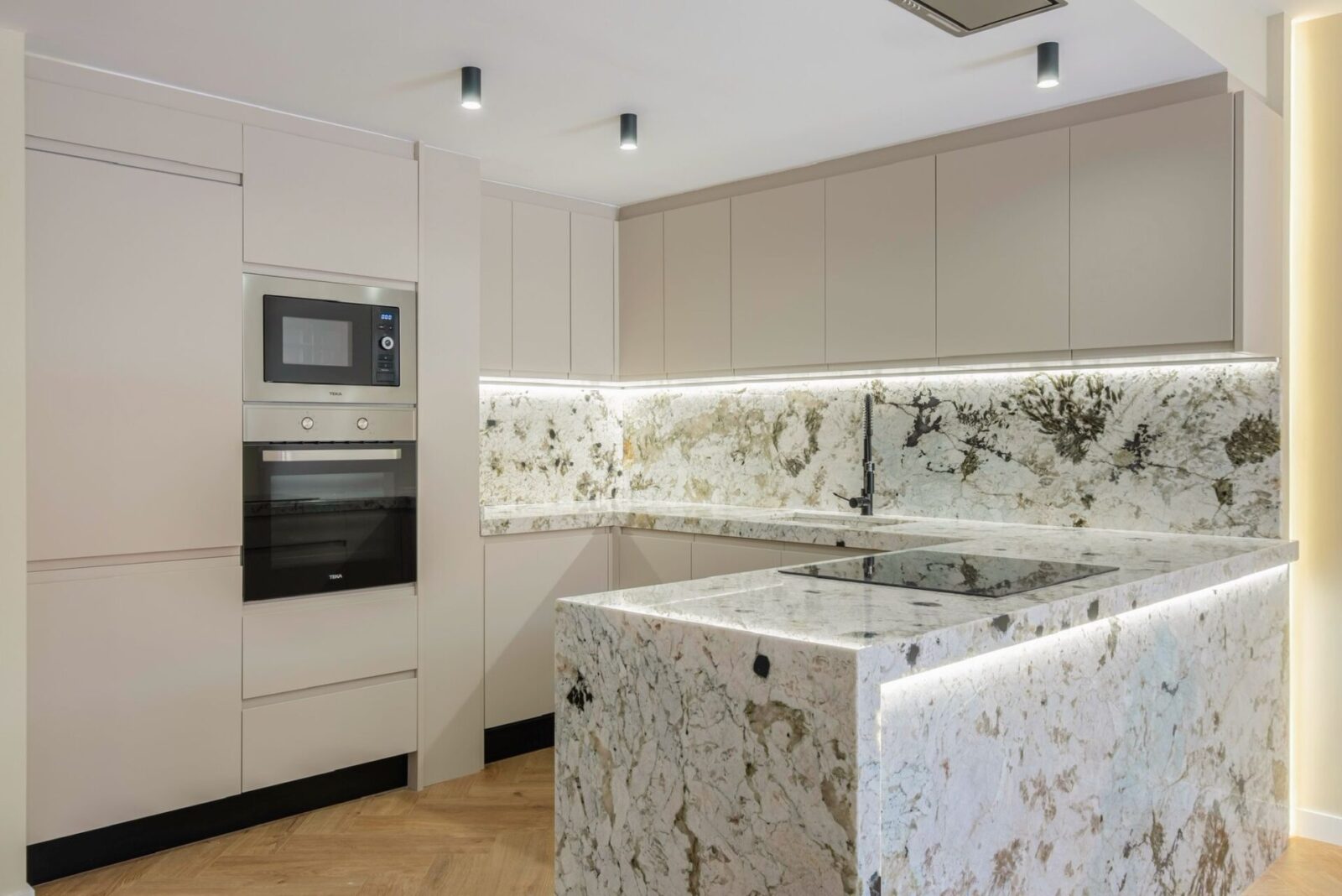 La vivienda destaca por un diseño contemporáneo y luminoso, con una zona de día abierta que integra cocina y salón, potenciando la amplitud y la entrada de luz natural. La cocina, de líneas limpias y elegantes, combina mobiliario en tonos neutros con una isla revestida en piedra natural que aporta carácter y funcionalidad, mientras que el suelo en espiga añade calidez y continuidad a todo el espacio.