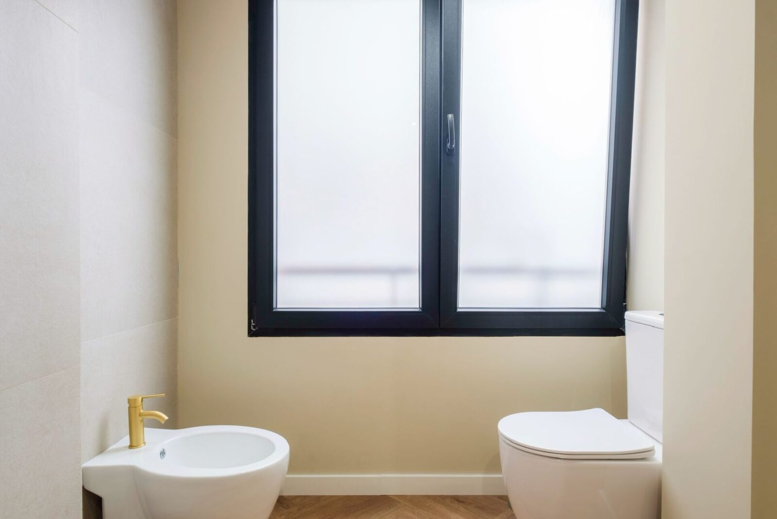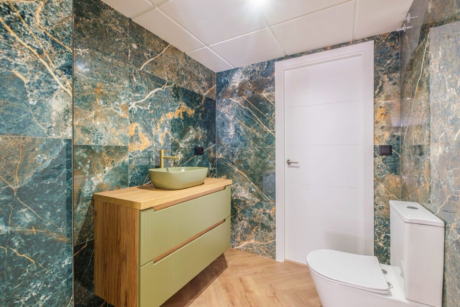 El baño, completamente renovado, apuesta por materiales de alto impacto visual: revestimientos marmoleados en tonos verdes y dorados, mueble suspendido con acabados en madera y lavabo sobre encimera que refuerzan una estética sofisticada y actual. Un conjunto cuidado al detalle que transmite calidad, diseño y confort en pleno centro de Alicante.